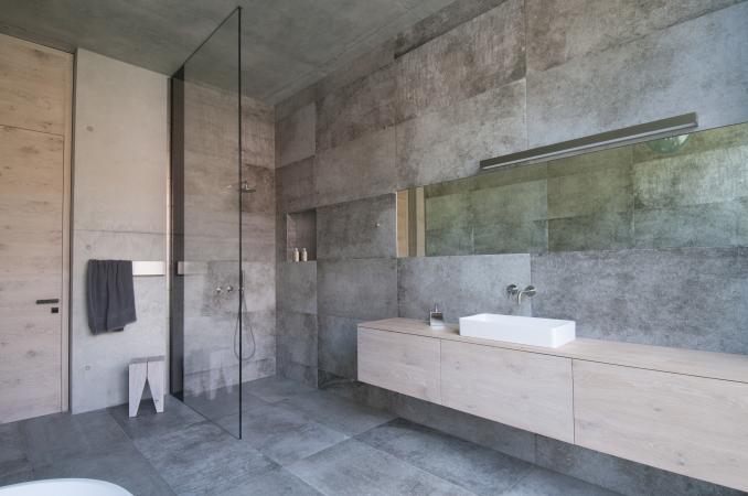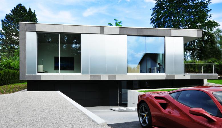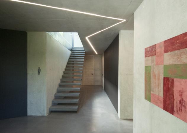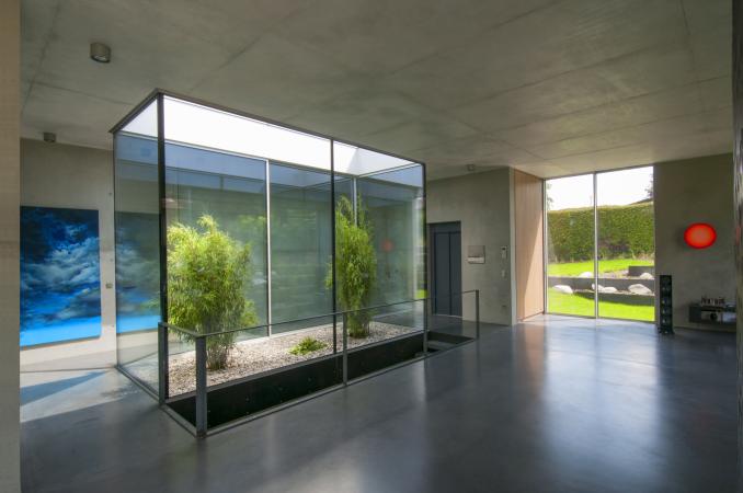 Ein Haus in Sichtbeton-überzogen mit einem Muster aus sandgestrahlten Flächen - angezogen wie mit einem Kleid und zeigt sich doch in seiner ganzen Nacktheit. Das Grundstück mit leichter Hanglage liegt am Ostufer des Starnberger See's, 5 Minuten vom See entfernt. Das Haus hat 300 qm Wohnfläche, 430 qm Nutzfläche. Der Flachbau wurde fast durchgehend in Sichtbeton konstruiert. So sind fast alle Wände im Gebäudeinneren Sichtbetonwände und alle Decken Sichtbetondecken aus Ortbeton. Die Betonfassade wurde aus Fertigteilen mit 18cm Kerndämmung hergestellt. Die Betonflächen in der Fassade wurden mit Aluminiumverbundtafeln kombiniert. Im Gebäudeinneren wurden dem Sichtbeton die Materialien weiß gebeizte Eiche und schwarzes Linoleum zugeordnet. Der konsequente Einsatz von Beton setzt sich fort mit der Verwendung von anthrazit eingefärbtem Sichtestrich. Nur in Schlaf- und Naßräumen sind die Böden mit grauem Feinsteinzeug belegt. Die Erschließung des Hauses erfolgt - begünstigt durch die Hanglage - über eine Rampe mit begleitender Stufenanlage über das Sockelgeschoss. Rampe, Stufenanlage und überdachter Vorplatz sind dem Sockelgeschoß vorgelagert und in das Gelände geschnitten. Durch diesen Negativraum erfährt das Sockelgeschoß eine entsprechende Bedeutung. Durch das zurückgezogene, mit schwarz eloxiertem Aluminium verkleidete Sockelgeschoss schwebt das Obergeschoss – der Hautwohnbereich – über dem Gelände Inmitten des Obergeschosses befindet sich ein Lichthof, um den sich alle Räumer herumgruppieren. Der Lichthof ist das Zentrum und Herz des Hauses.